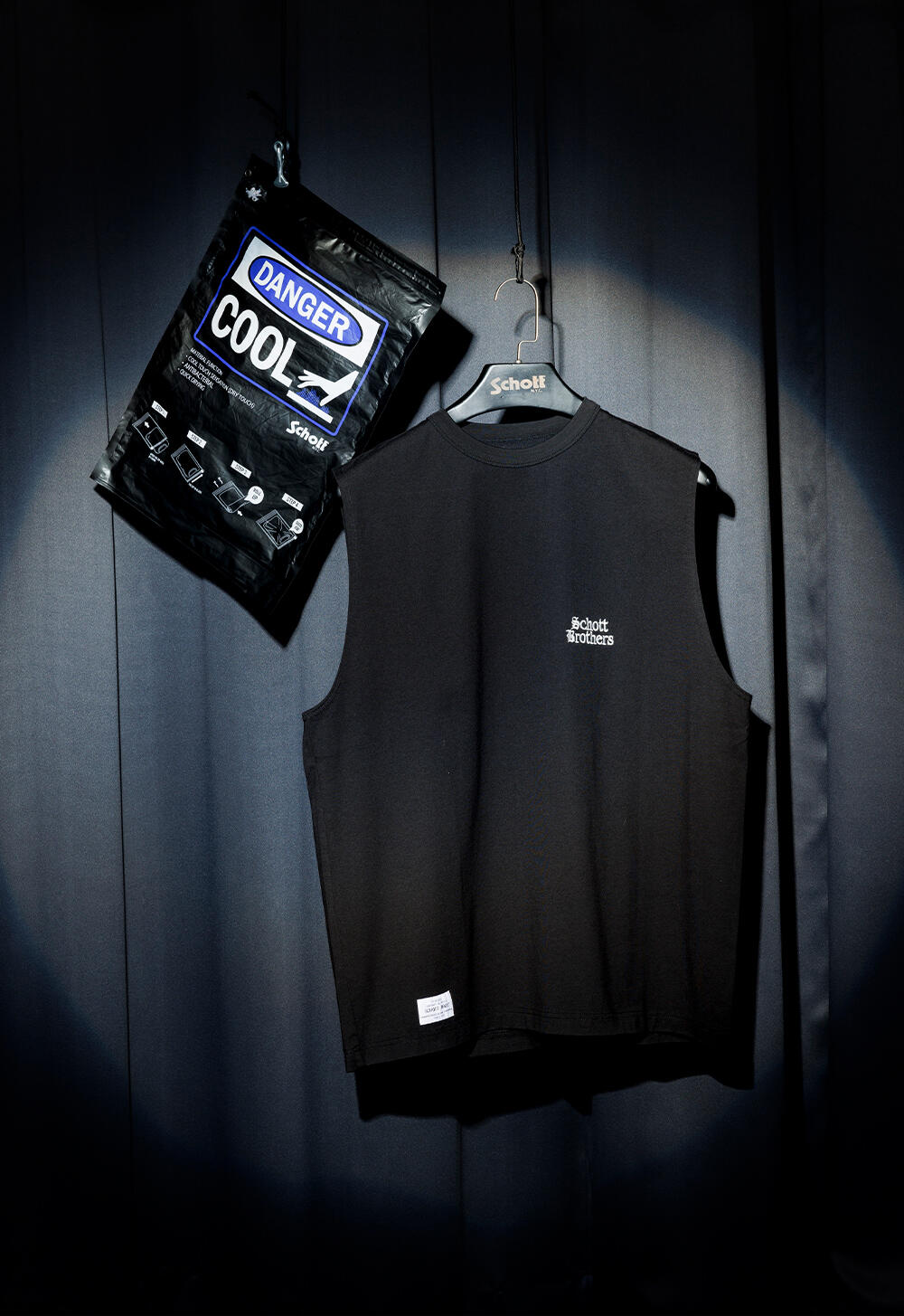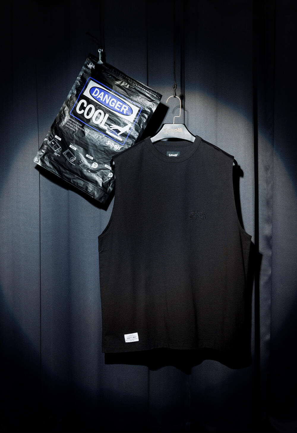ストリートライクなノースリーブTシャツはシンプルながらもTシャツとはまた違った表情が楽しめる。